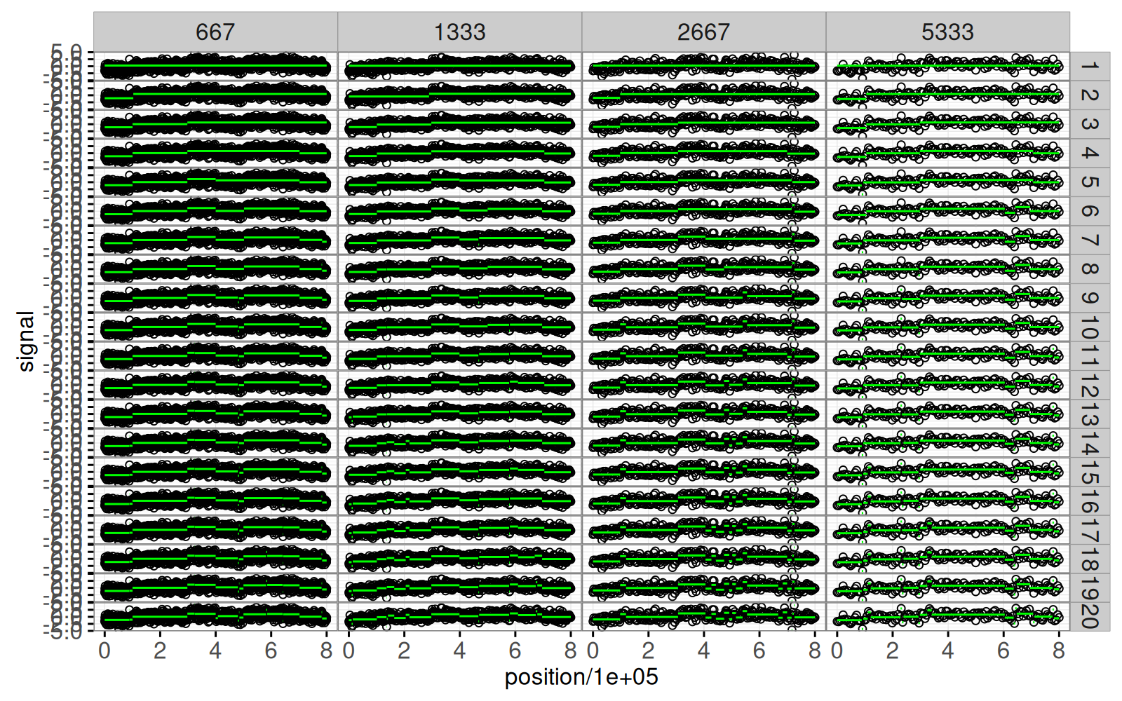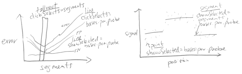 Le graphique ci-dessus comprend un geom_tallrect avec clickSelects=segments et un geom_line avec clickSelects=bases.per.probe. Il sera utilisé pour sélectionner les données et le modèle dans le graphique ci-dessous.