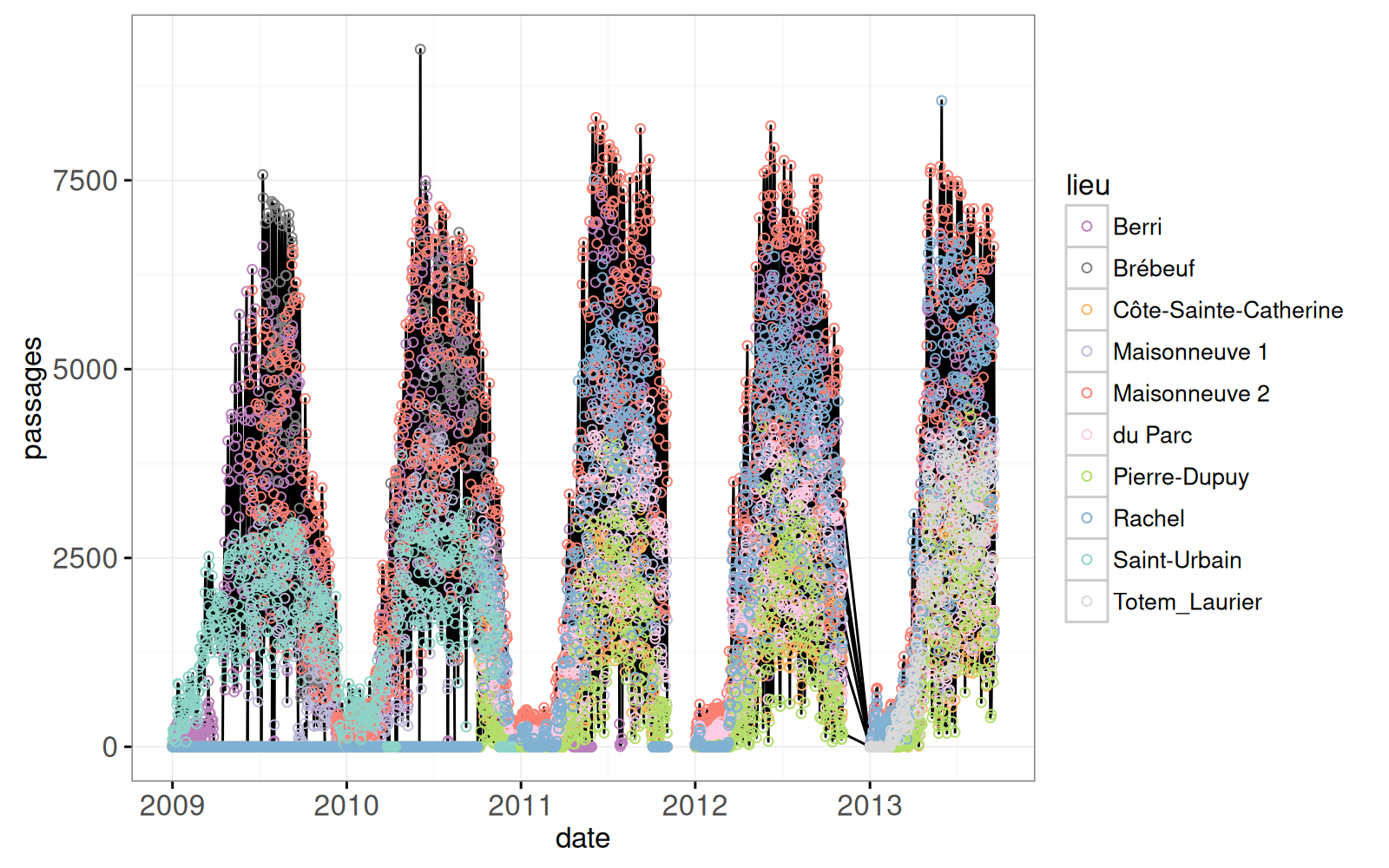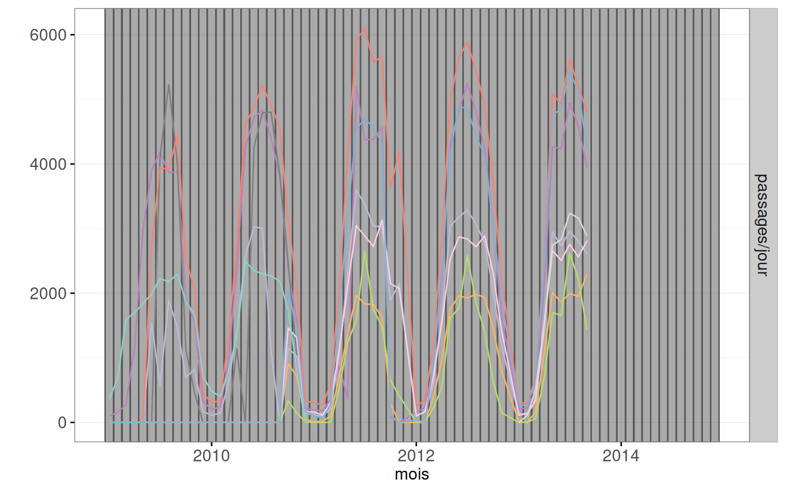 aes(color=lieu)pour chaque compteur, dont la taille varie en fonction des passages dans le mois sélectionné. - Sur le graphique