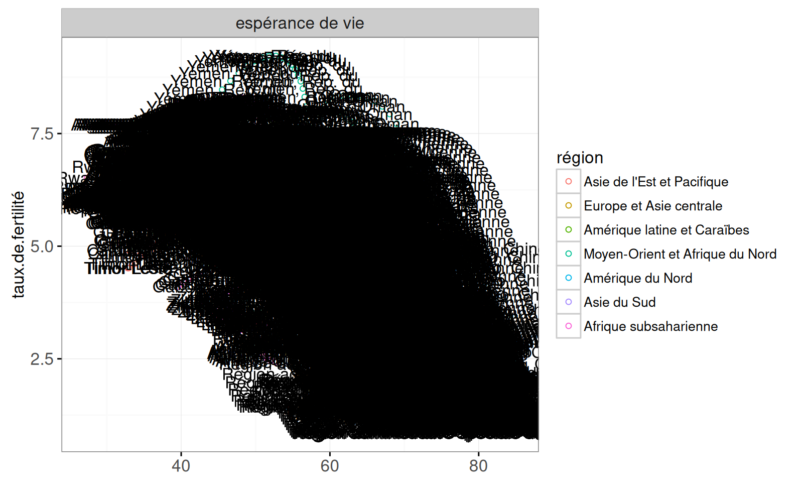x=espérance.de.vie, y=taux.de.fertilité, label=pays,
