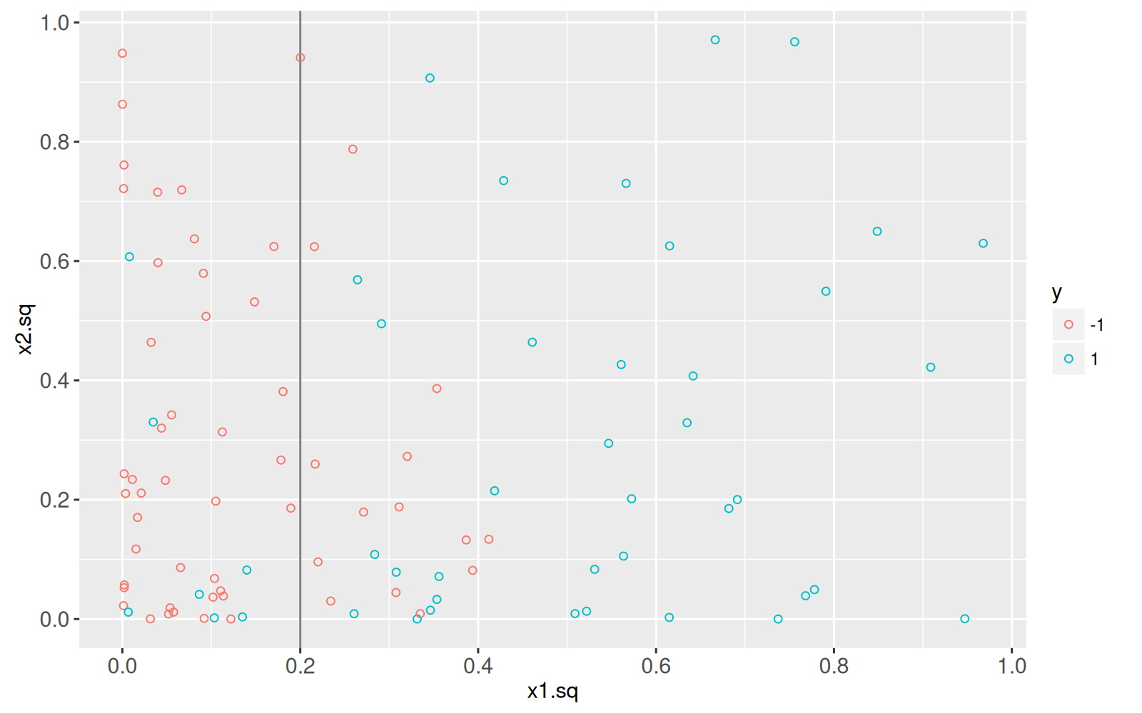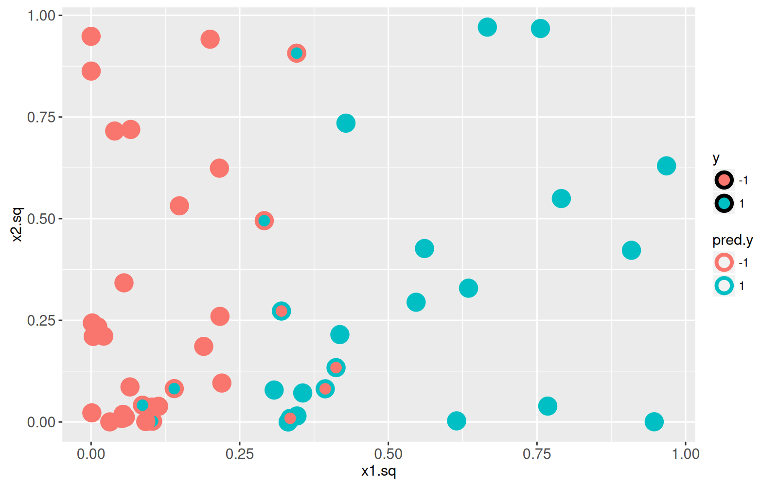 The plot below shows the same data, after computing two additional input features (the squares of the original two inputs).