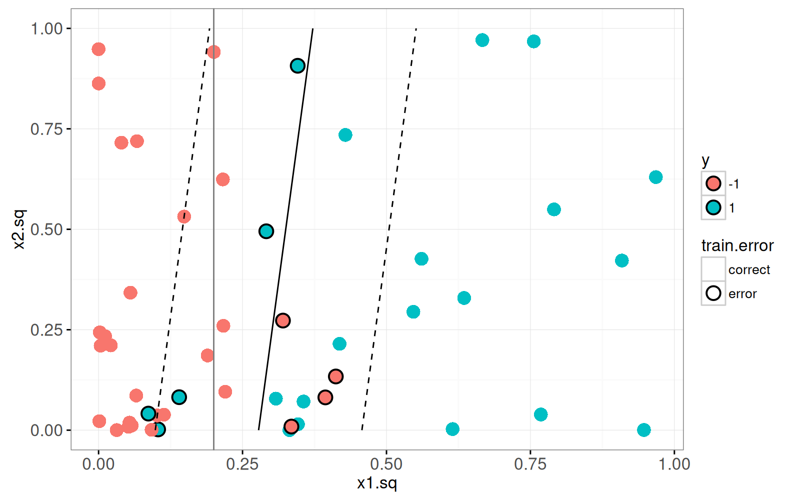The plot below shows the scores and labels, as a function of the squared feature `x1.sq`.