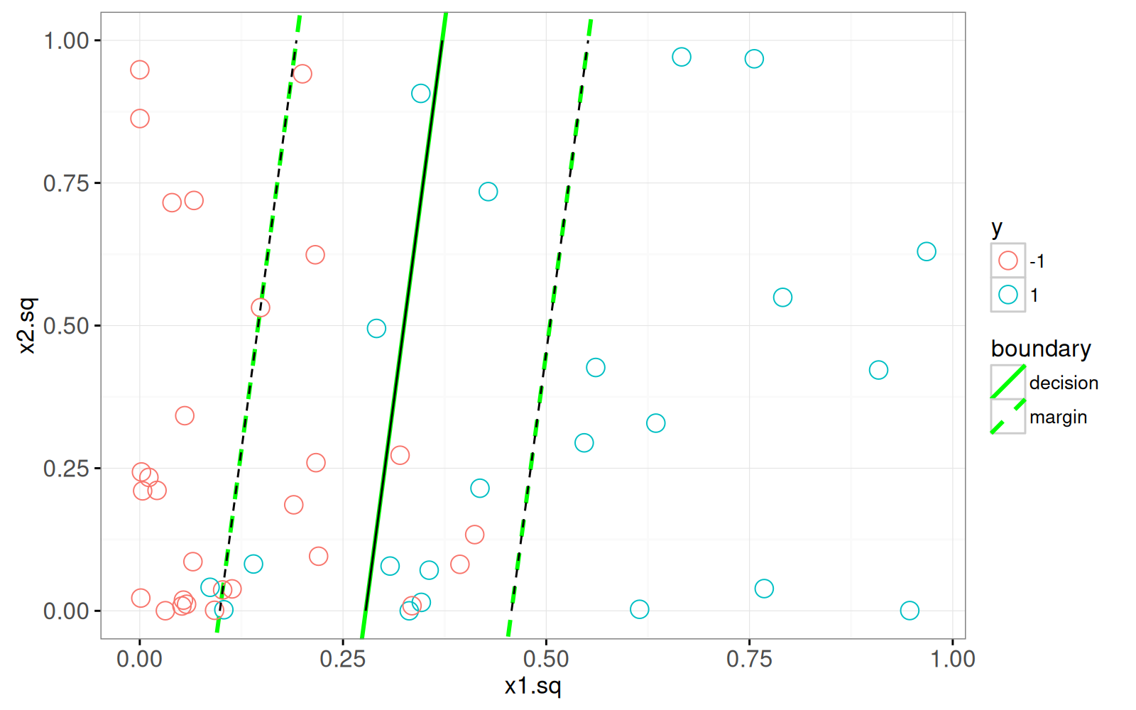 In the previous section we fit a linear kernel in the squared feature space, which resulted in learning a function which is non-linear in terms of the original feature space.