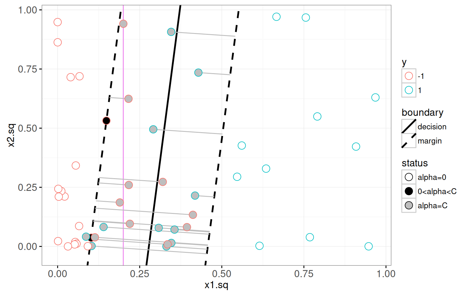 - In the last section, we make an interactive data visualization to show how the decision boundary of the polynomial kernel Support Vector Machine changes as a function of the two hyper-parameters (cost and degree).