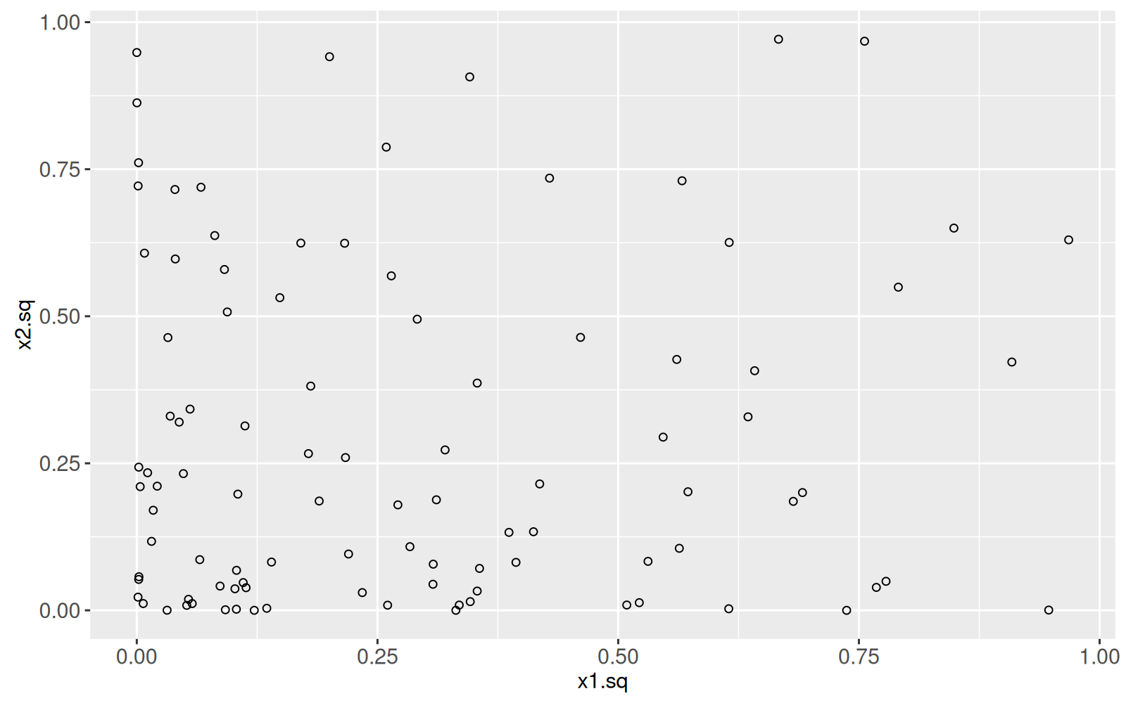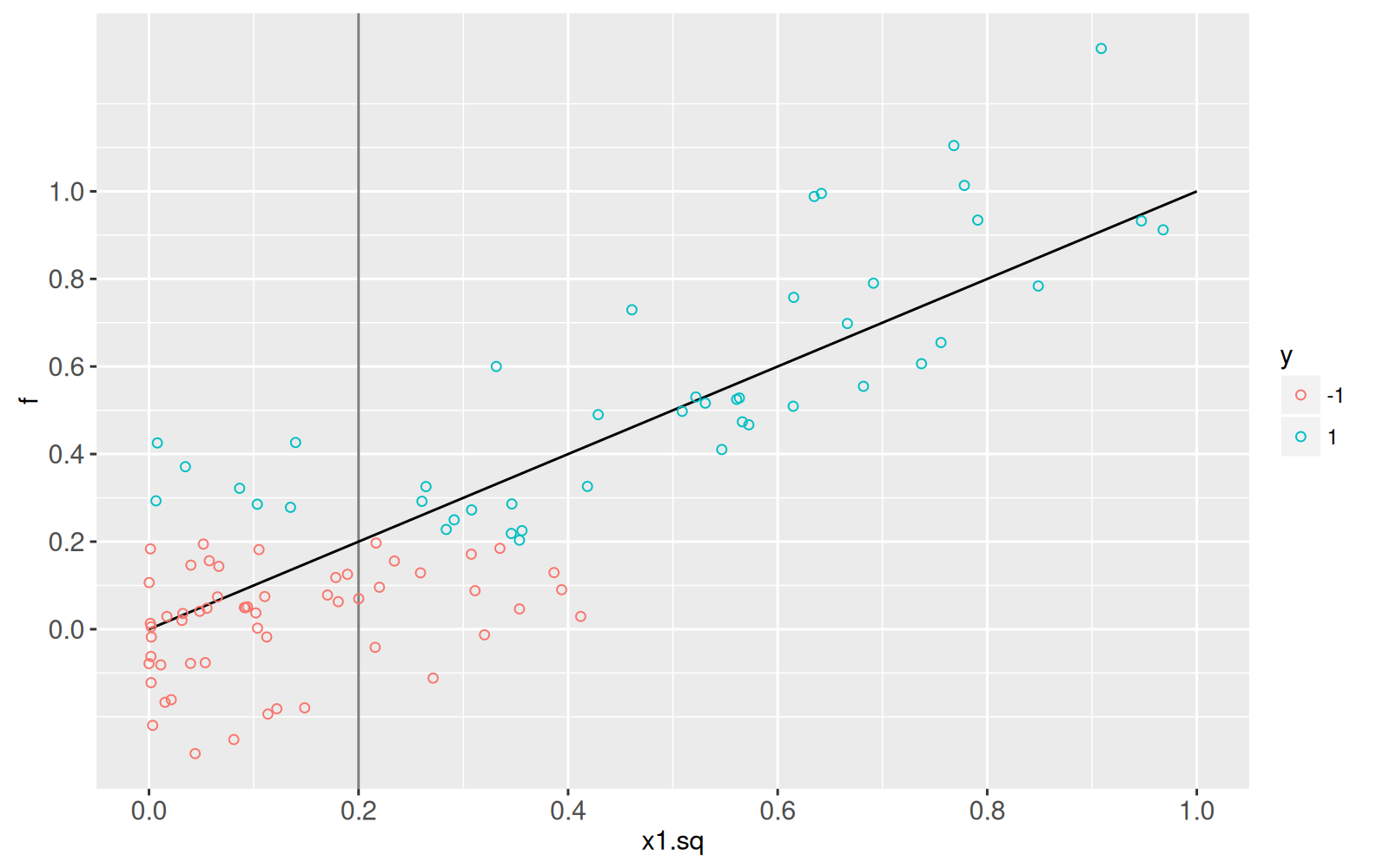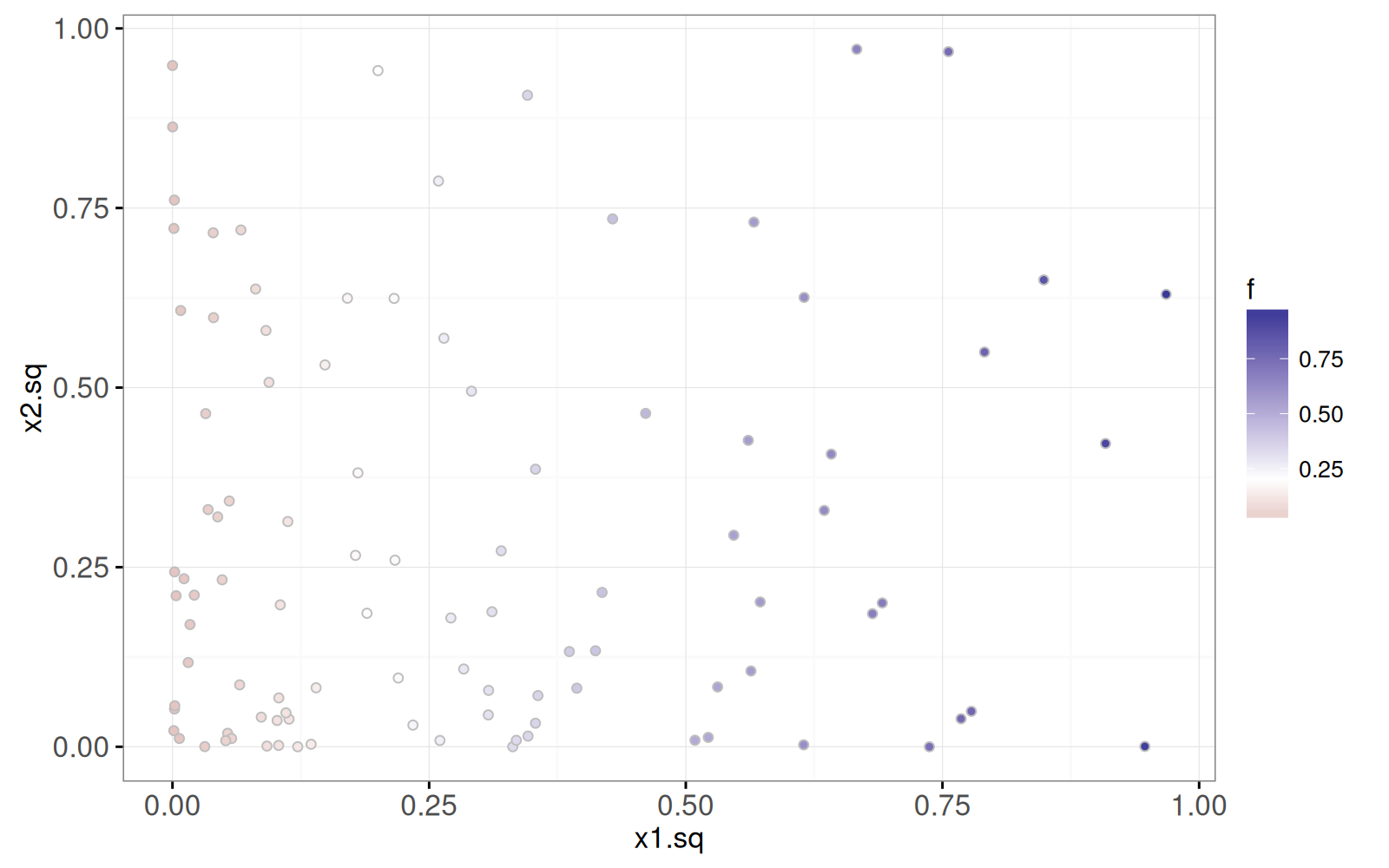 In our simulation, we assume that the output score `f` is a linear function of `x1.sq`, and ignores `x2.sq`.