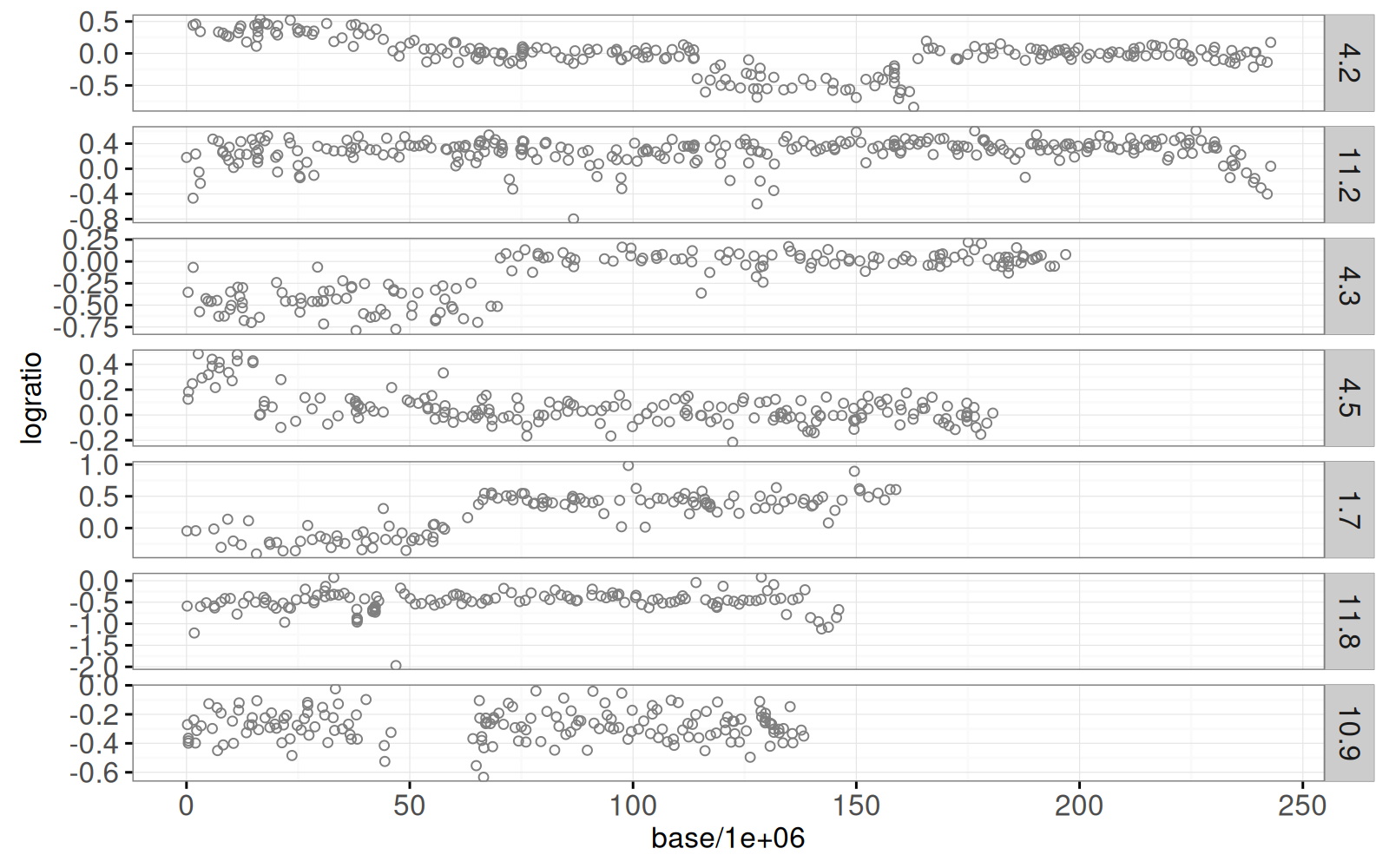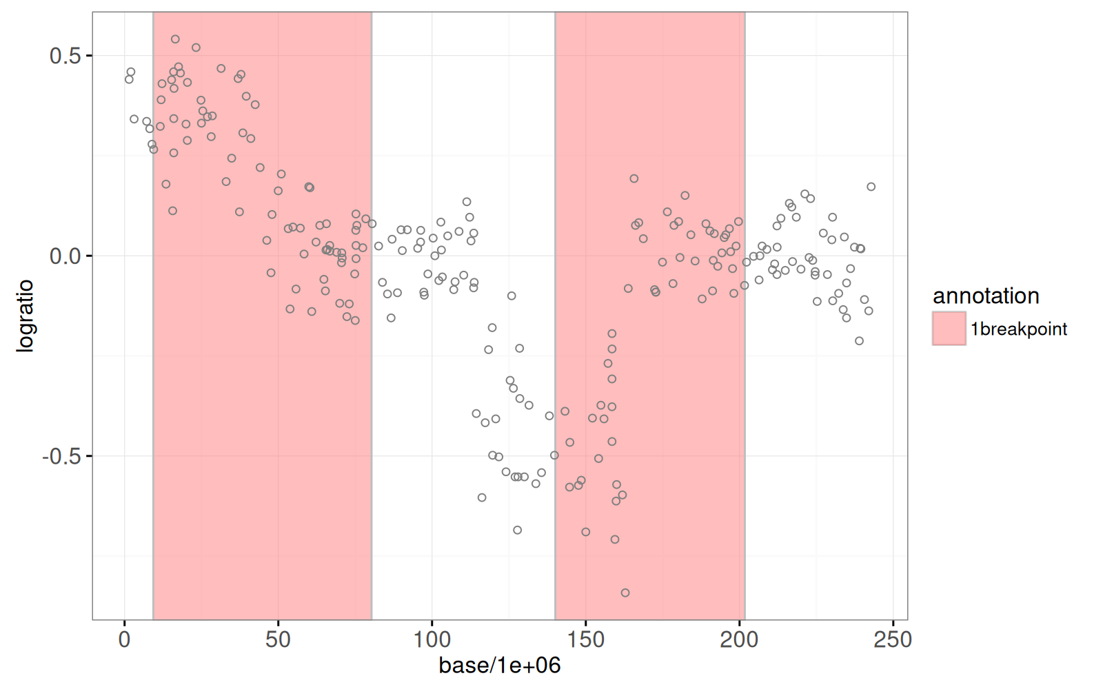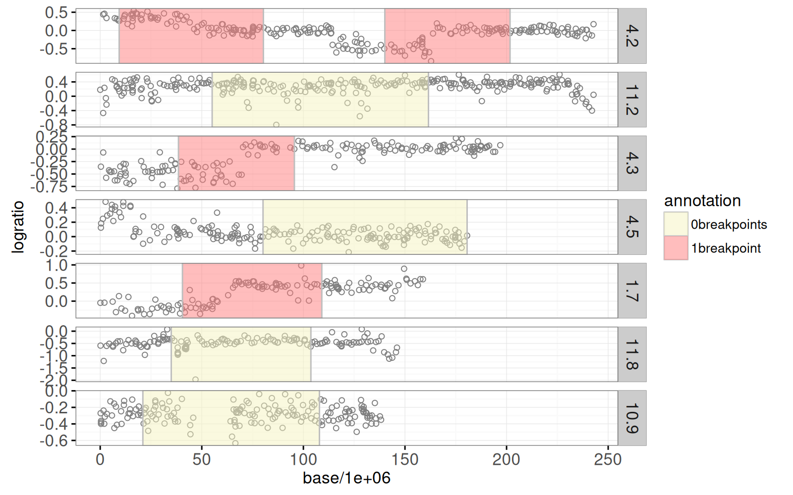 An important part of the diagnosis is detecting "breakpoints" or abrupt changes, within a given chromosome (panel).