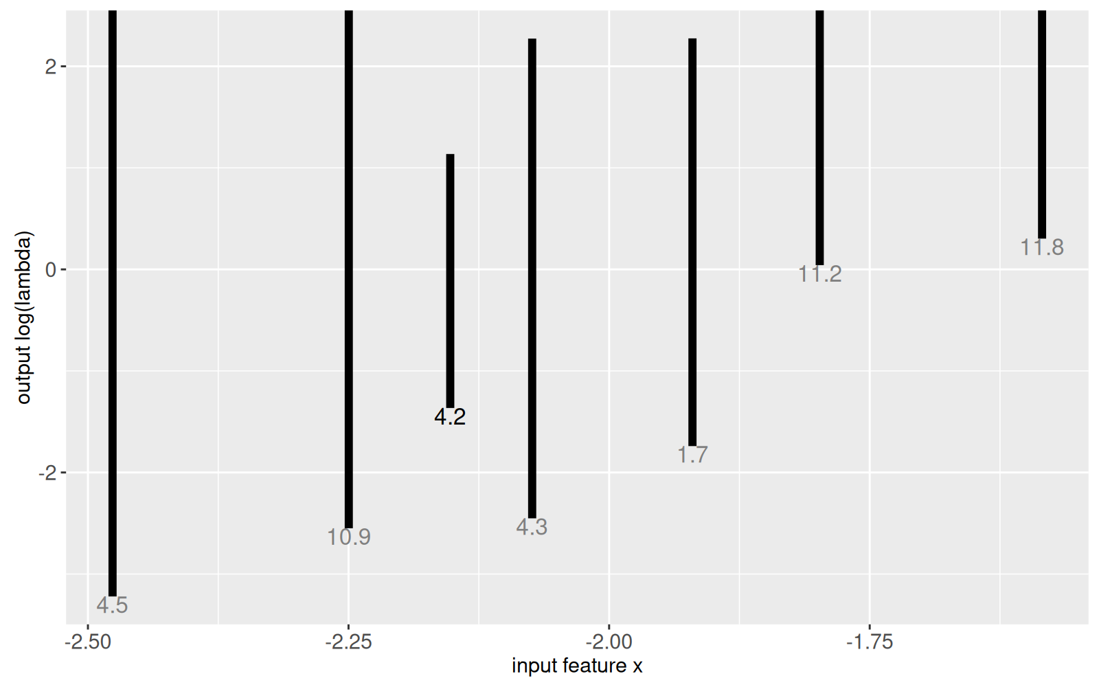 Below we plot this interval as a function of a feature of the data (log number of data points):