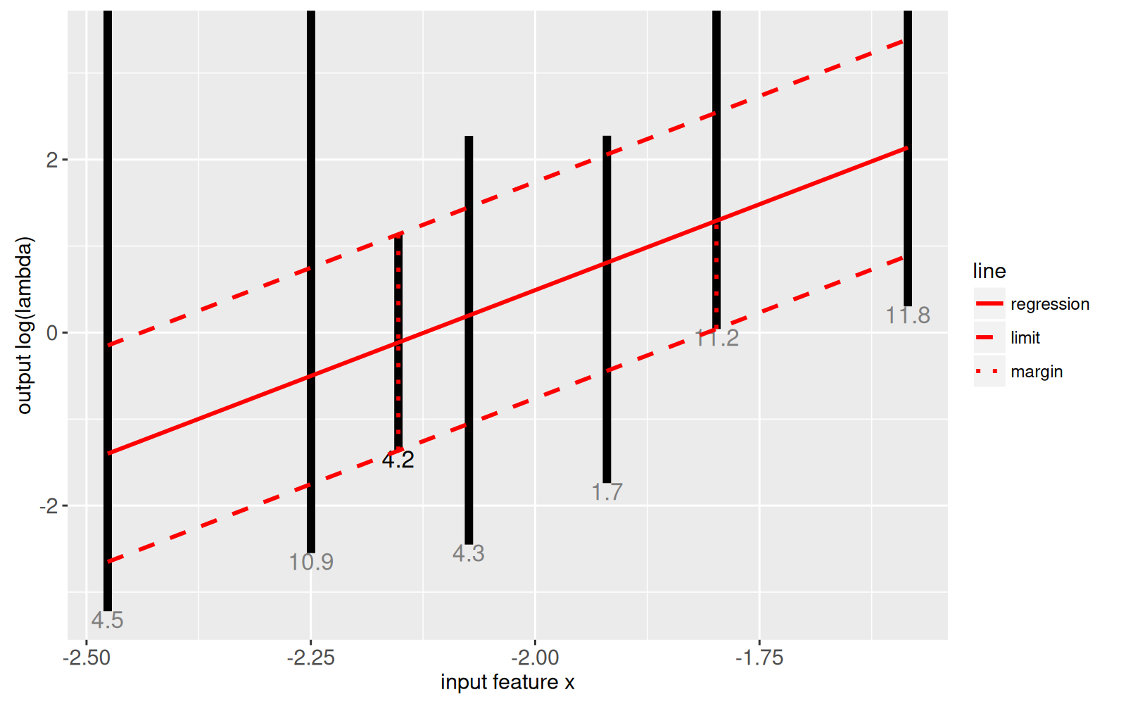 Machine learning algorithms can be used to find a penalty function that intersects each of the intervals, and maximizes the margin (the distance between the regression function and the nearest interval limit).