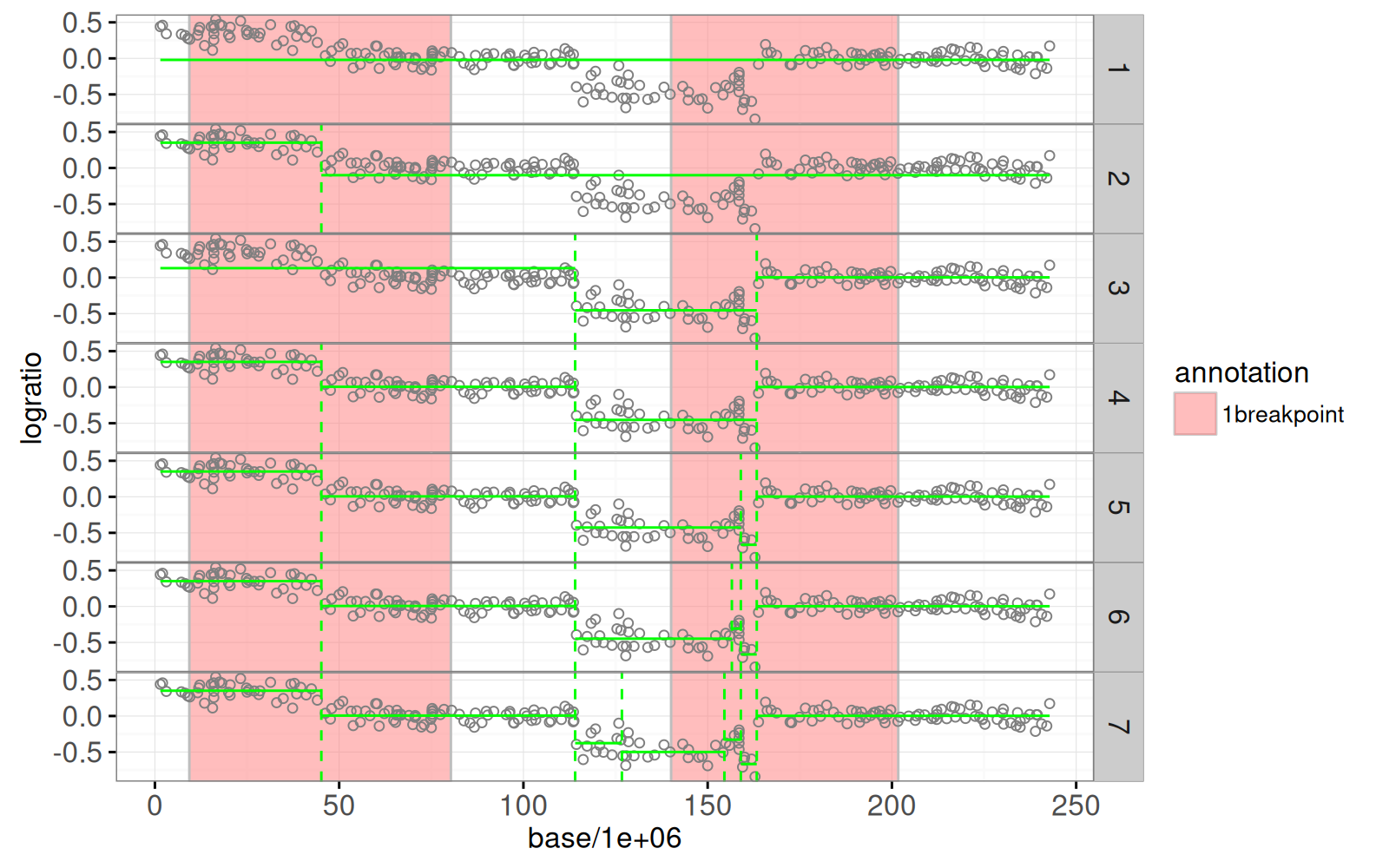 In order to detect these breakpoints we have fit some maximum likelihood segmentation models, using the efficient algorithm implemented in `jointseg::Fpsn`.