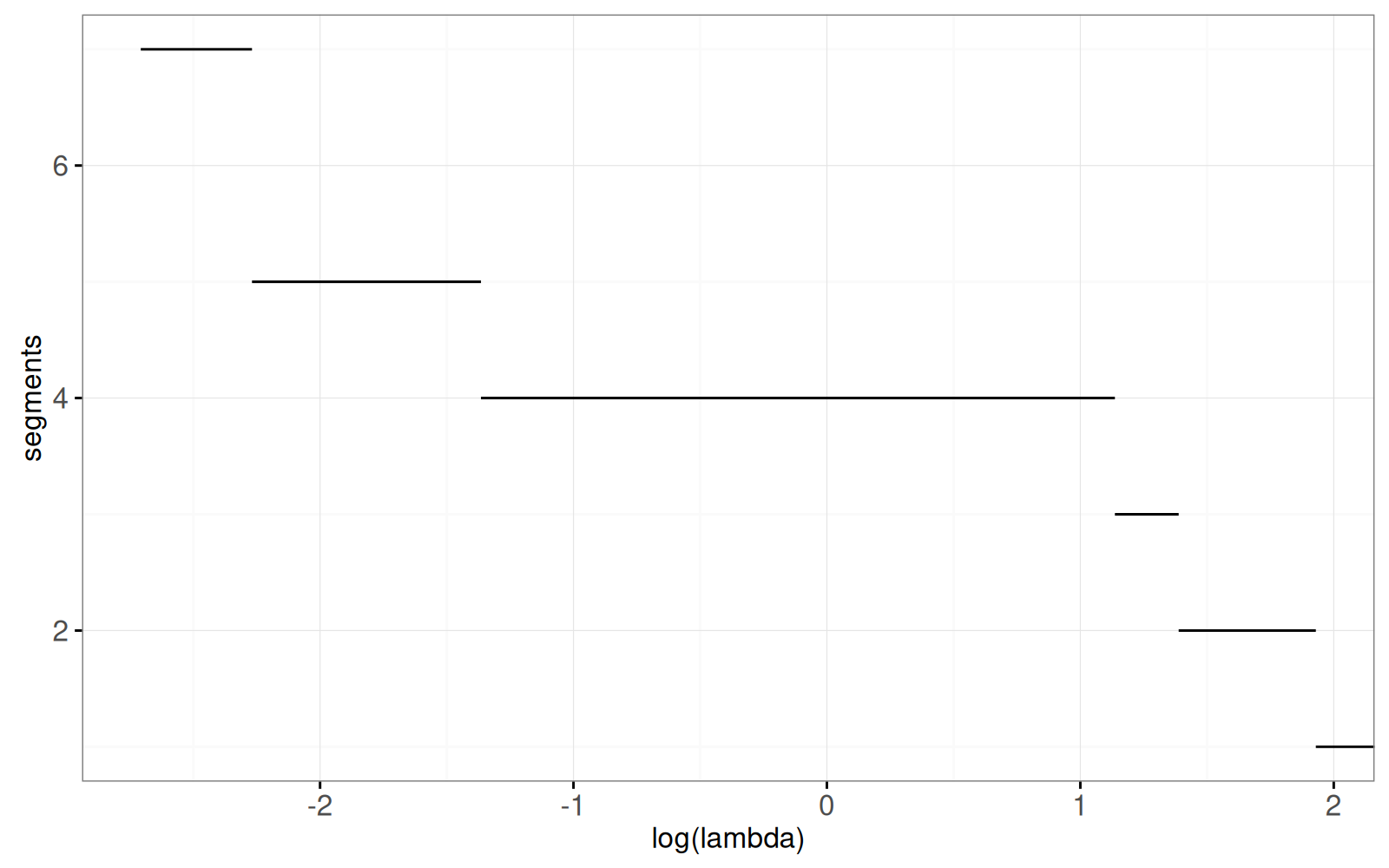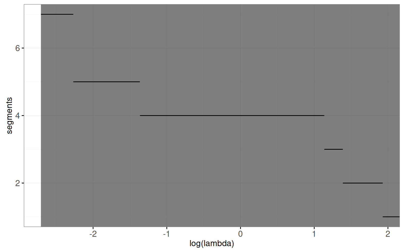 Note that in the data viz above the model with 6 segments is not selectable for any value of lambda, so there is no way to click on the plot to select that model.